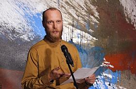 Презентация произведений австрийского художника Германа Нитча "MZM_025_09", "13_14", "07_17", переданных в фонд Третьяковской галереи, прошла в Новой Третьяковке на Крымском Валу. Куратор выставки Сергей Фофанов во время презентации.