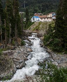 Виды Домбая. Жанровая фотография. Туристы у реке Уллу-Муруджу.