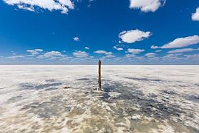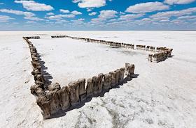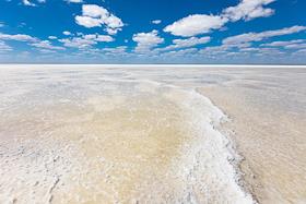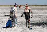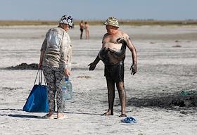 Виды соленого озера Эльтон. Отдыхающие в лечебной грязи на озере.