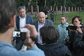 5-я акция протеста против реконструкции городского парка отдыха "Швейцария". Глава администрации Приокского района Нижнего Новгорода Михаил Шатилов (в центре) во время встречи с протестующими.
