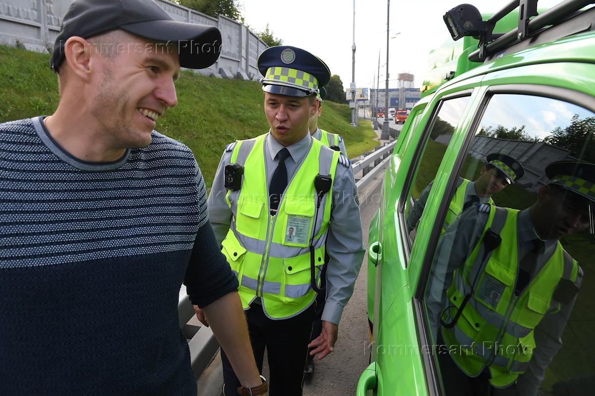 Работа аварийных комиссаров Центра организации дорожного движения (ЦОДД). Сотрудники "Дорожного патруля" во время оформления документов на месте автомобильной аварии.