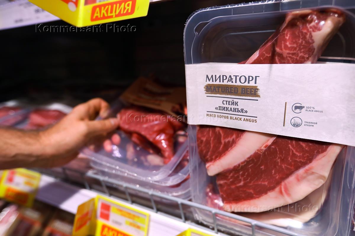 Работа супермаркета "Зельгрос". Жанровая фотография. Мясная продукция компании "Мираторг" на прилавке магазина.