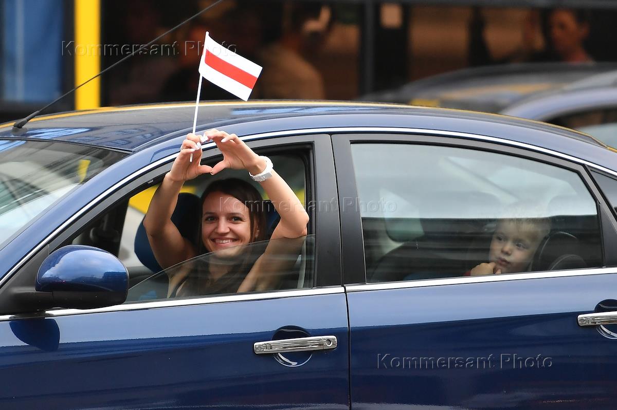 The political situation in Minsk. Participants of the Chain of Repentance opposition supporters rally. Genre photo. Young woman holding opposition flag drives a car.
