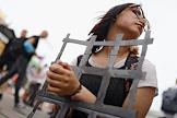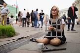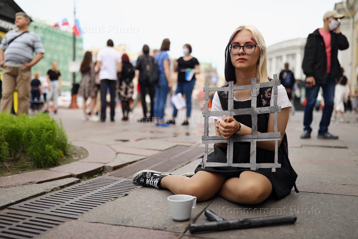 Пикеты у Гостиного двора в поддержку протестующих больше месяца хабаровчан и защитников башкирского шихана, а также против насилия силовиков в Белоруссии и за расследование истории с отравлением оппозиционного политика Алексея Навального. Участница во время акции.