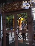 Виды Москвы. Жанровая фотография. Здание Московской биржи на перекрестке Среднего и Большого Кисловских переулков. Мужчина снимает на мобильный телефон эмблему Московской биржи.