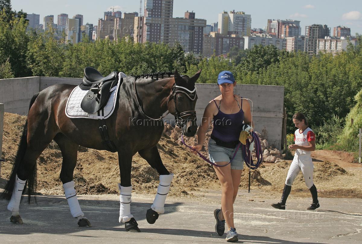 Командный Чемпионат России по выездке прошел в конно-спортивном комплексе "Пассаж". Жанровая фотография. Подготовка к соревнованиям.
