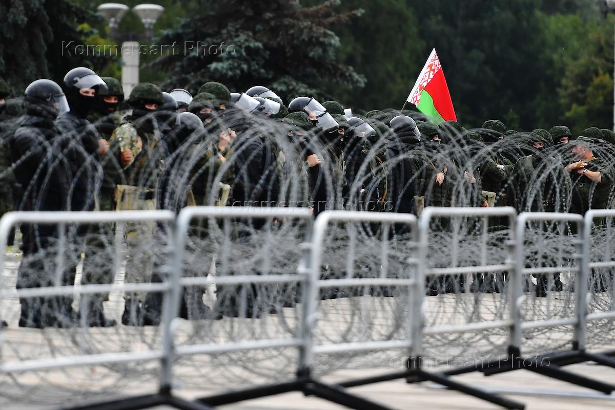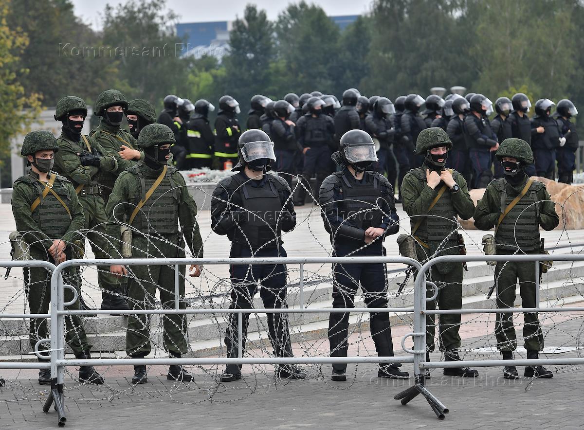 Ситуация в Минске. Акция протеста сторонников оппозиции на площади Независимости. Со дня выборов президента Белоруссии 9 августа в Минске и других городах республики проходят массовые акции протеста несогласных с результатами голосования. Сотрудники правоохранительных органов во время акции.