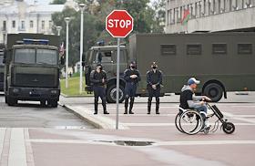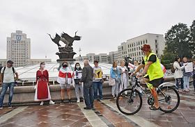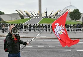 Ситуация в Минске. Акция протеста сторонников оппозиции на площади у Музейно-паркового комплекса "Победа". Со дня выборов президента Белоруссии 9 августа в Минске и других городах республики проходят массовые акции протеста несогласных с результатами голосования. Участник акции и сотрудники правоохранительных органов во время акции на фоне обелиска "Минск - город-герой".