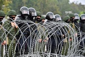 Ситуация в Минске. Акция протеста сторонников оппозиции на площади у Музейно-паркового комплекса "Победа". Со дня выборов президента Белоруссии 9 августа в Минске и других городах республики проходят массовые акции протеста несогласных с результатами голосования. Сотрудники правоохранительных органов во время акции на фоне обелиска "Минск - город-герой".