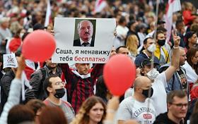 Ситуация в Минске. Акция протеста сторонников оппозиции на площади Независимости. Со дня выборов президента Белоруссии 9 августа в Минске и других городах республики проходят массовые акции протеста несогласных с результатами голосования. Портрет президента Белоруссии Александра Лукашенко в руках участника акции