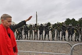 Ситуация в Минске. Акция протеста сторонников оппозиции на площади у Музейно-паркового комплекса "Победа". Со дня выборов президента Белоруссии 9 августа в Минске и других городах республики проходят массовые акции протеста несогласных с результатами голосования. Член координационного совета оппозиции Белоруссии Мария Колесникова и сотрудники правоохранительных органов во время акции на фоне обелиска "Минск - город-герой".