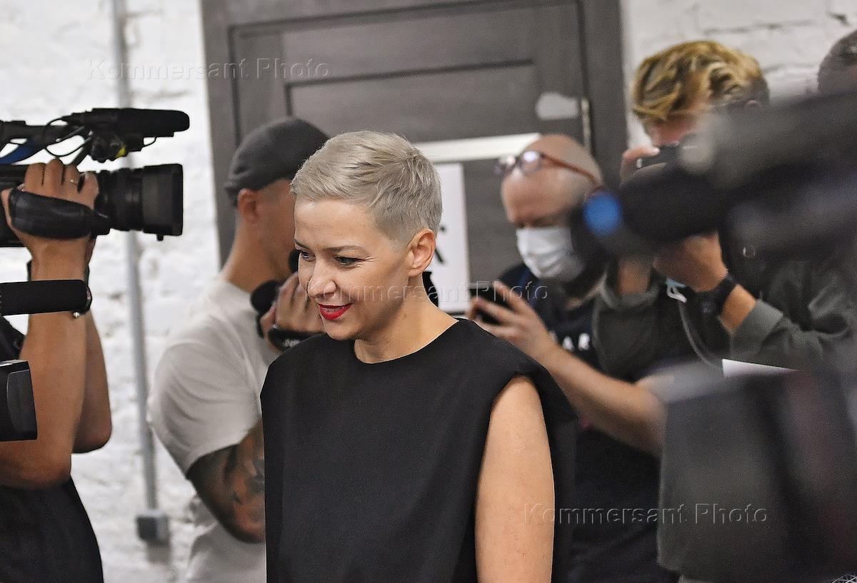 Политическая ситуация в Белоруссии. Пресс-конференция Координационного совета оппозиции Белоруссии. Член координационного совета оппозиции Мария Колесникова (в центре) во время пресс-конференции.