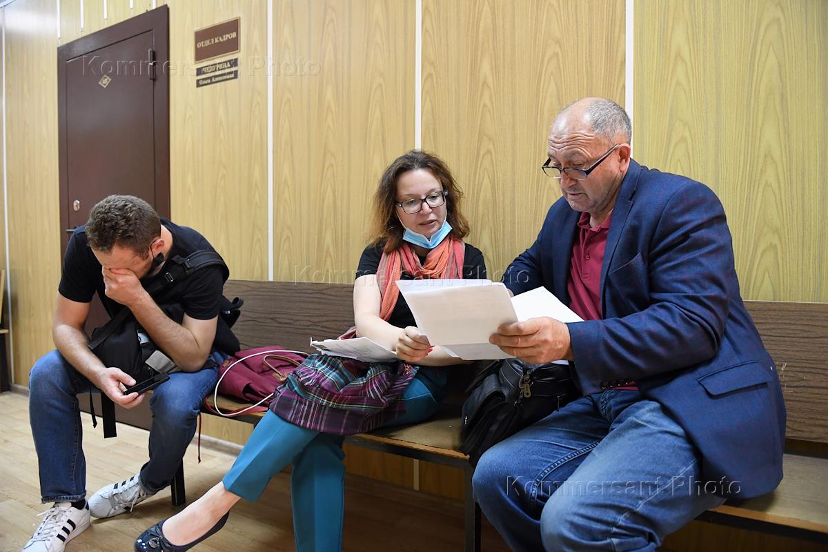 Kommersant's columnist on foreign affairs Marianna Belenkaya (center) is seen before the hearing in the Khamovnichesky District Court.