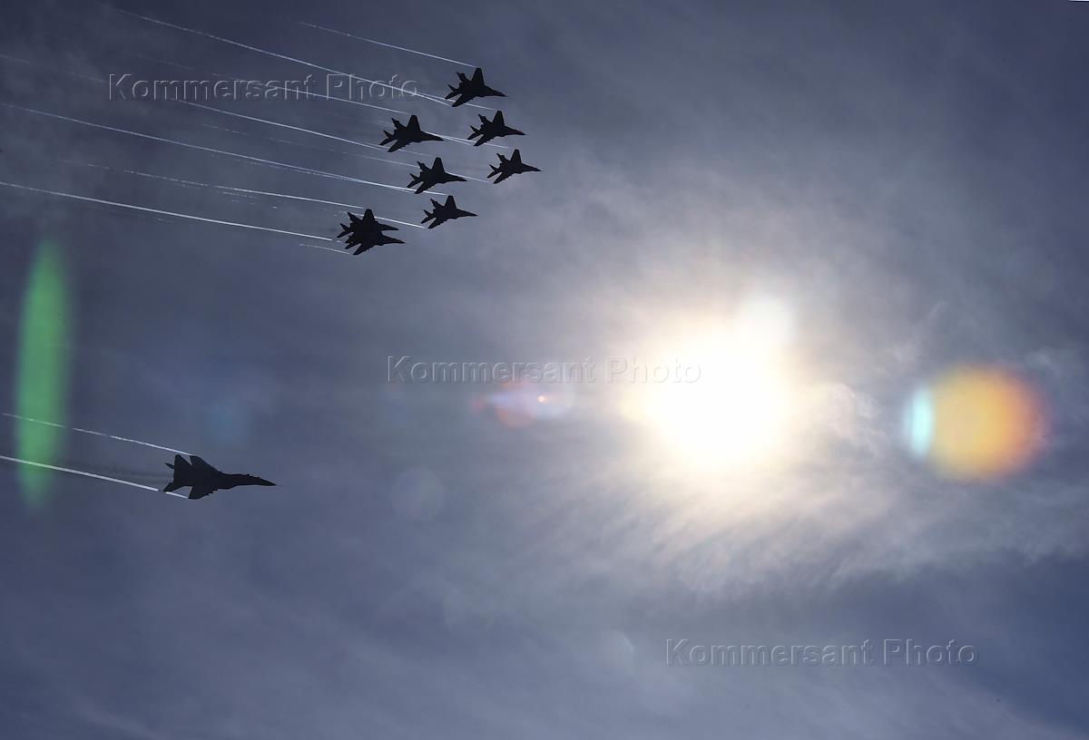 Международный военно-технический форум "АРМИЯ-2020" и армейские международные игры-2020. День военно-технического сотрудничества. Группа высшего пилотажа "Стрижи" на самолетах МиГ-29 и истребитель Су-30СМ во время динамического показа авиатехники на аэродроме "Кубинка".