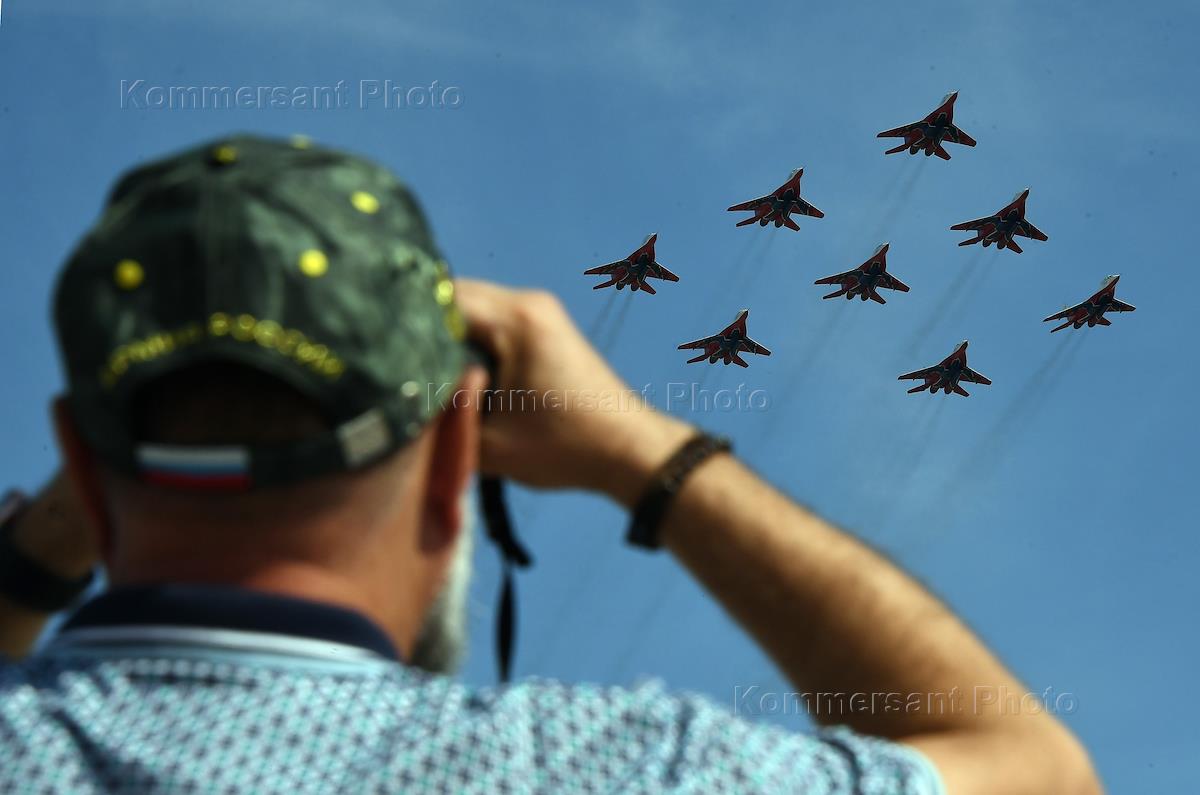 ARMY-2020 International Military-Technical Forum and International Army Games 2020. Military-Technical Cooperation Day. Spectator watches the aircraft dynamic display at the Kubinka airfield.