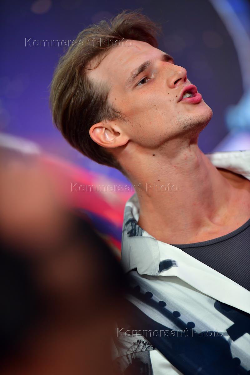 Premiere of Goalkeeper of the Galaxy directed by Russian film director Dzhanik Fayziev in the October Cinema. Russia singer Batishta (Kirill Petrov) (left) attends the premiere.