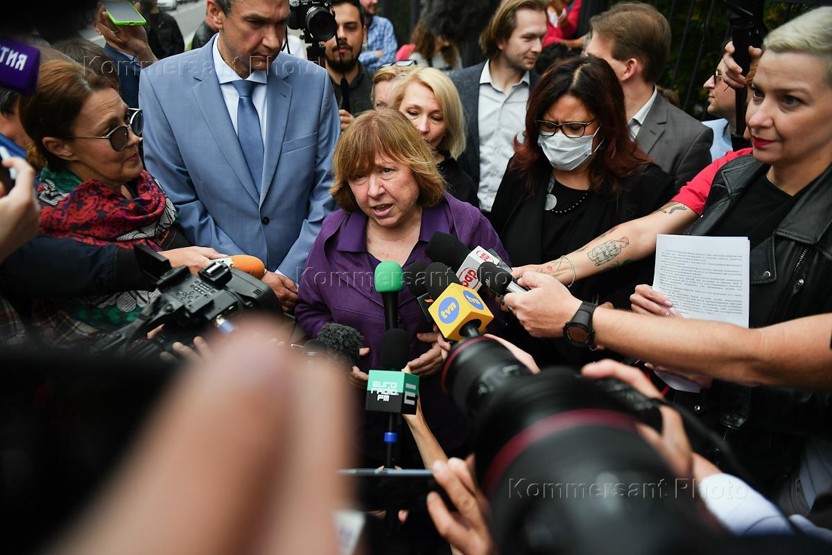 The political situation in Minsk. Nobel laureate in literature, member of the Belarusian Opposition Coordination Council Svetlana Aleksievich (center) is seen at the building of the Investigative Committee of Belarus, where she was summoned as witnesses in the criminal case on the establishment of the Coordination Council.