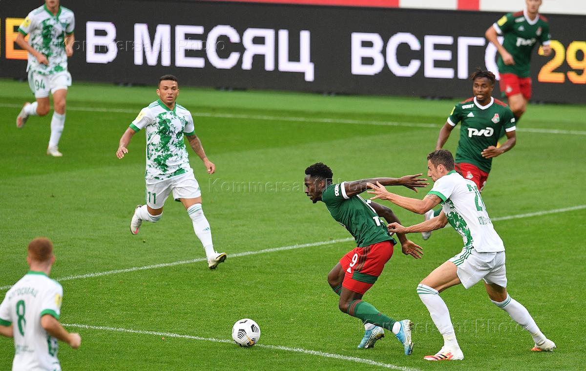 Tinkoff Russian Premier League (RPL). Russian Football Championship 2020/2021. Matchday 5. Match between Lokomotiv (Moscow) and Akhmat (Grozny) at the RZD Arena stadium. Akhmat goalkeeper Giorgi Shelia in action during the match.