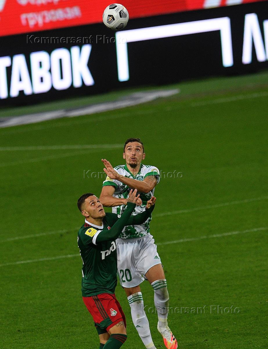 Российская Премьер-Лига (РПЛ). Тинькофф - Чемпионат России по футболу 2020/2021. 5-й тур. Матч между командами "Локомотив" (Москва) и "Ахмат" (Грозный) на стадионе "РЖД Арена". Игрок команды "Локомотив" Виталий Лисакович (слева) и игрок команды "Ахмат" Зорна Нижич (справа) во время матча.