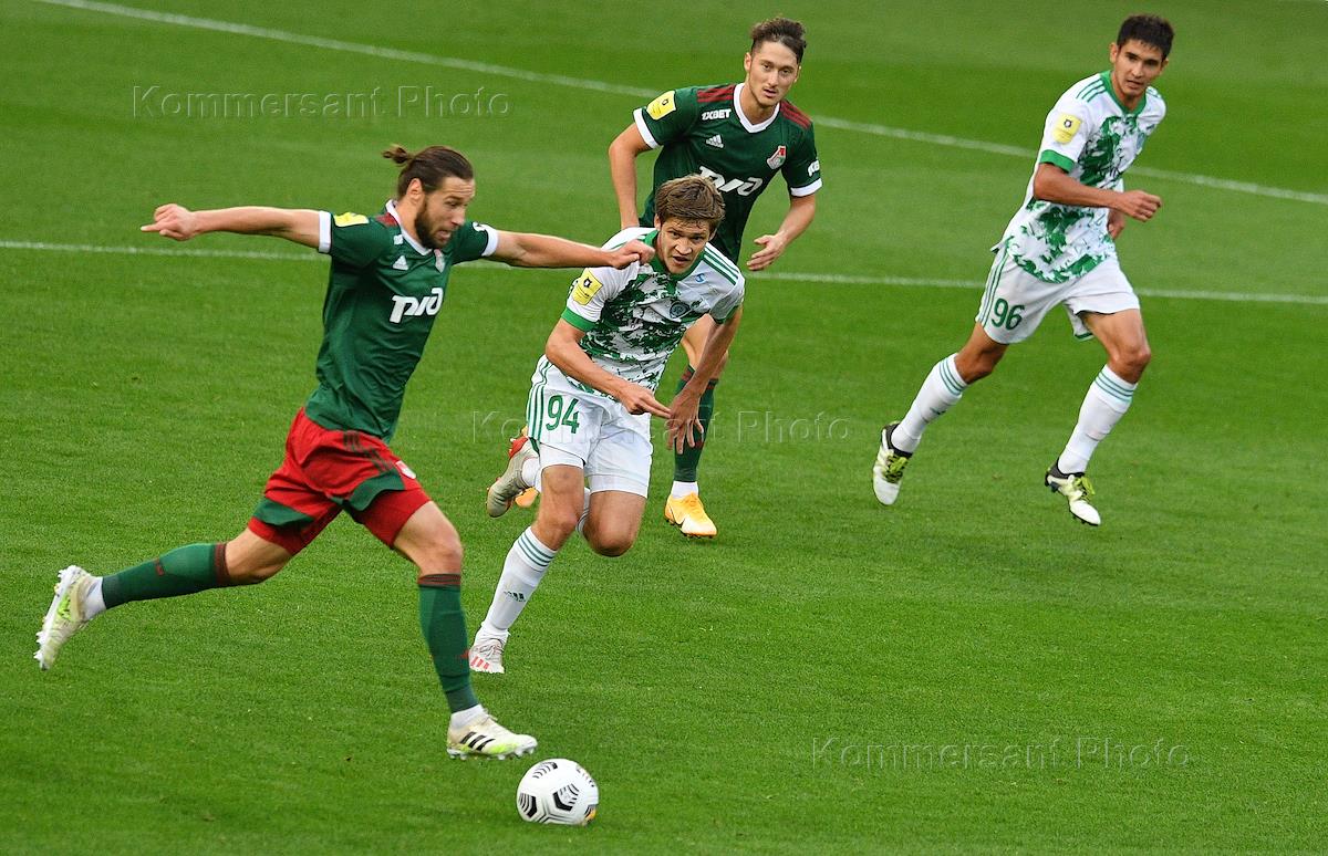 Tinkoff Russian Premier League (RPL). Russian Football Championship 2020/2021. Matchday 5. Match between Lokomotiv (Moscow) and Akhmat (Grozny) at the RZD Arena stadium. Akhmat goalkeeper Giorgi Shelia in action during the match.