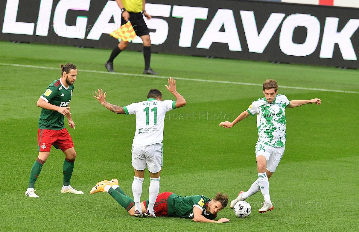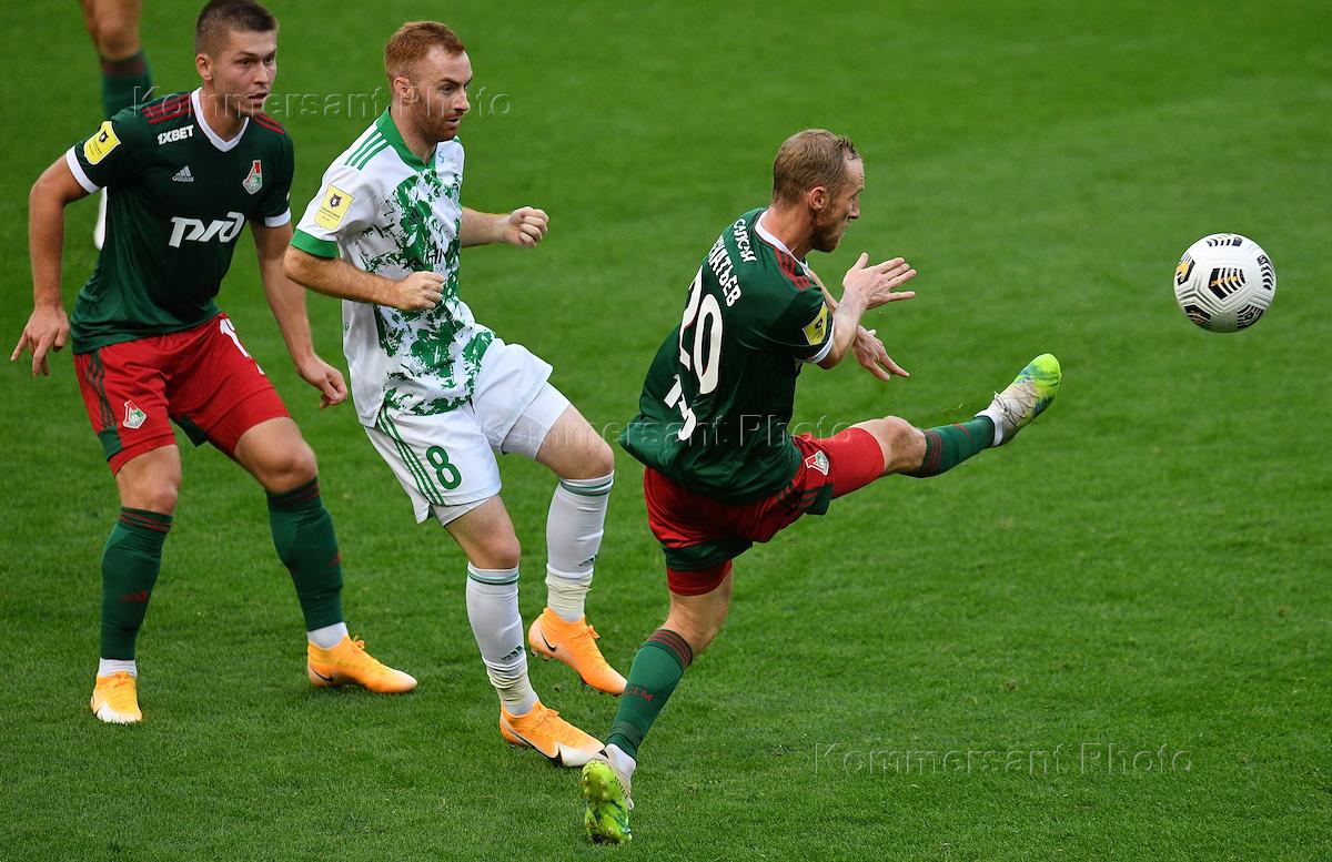 Российская Премьер-Лига (РПЛ). Тинькофф - Чемпионат России по футболу 2020/2021. 5-й тур. Матч между командами "Локомотив" (Москва) и "Ахмат" (Грозный) на стадионе "РЖД Арена". Игрок команды "Локомотив" Антон Миранчук (в центре) и игрок команды "Ахмат" Максим Ненахов (справа) во время матча.