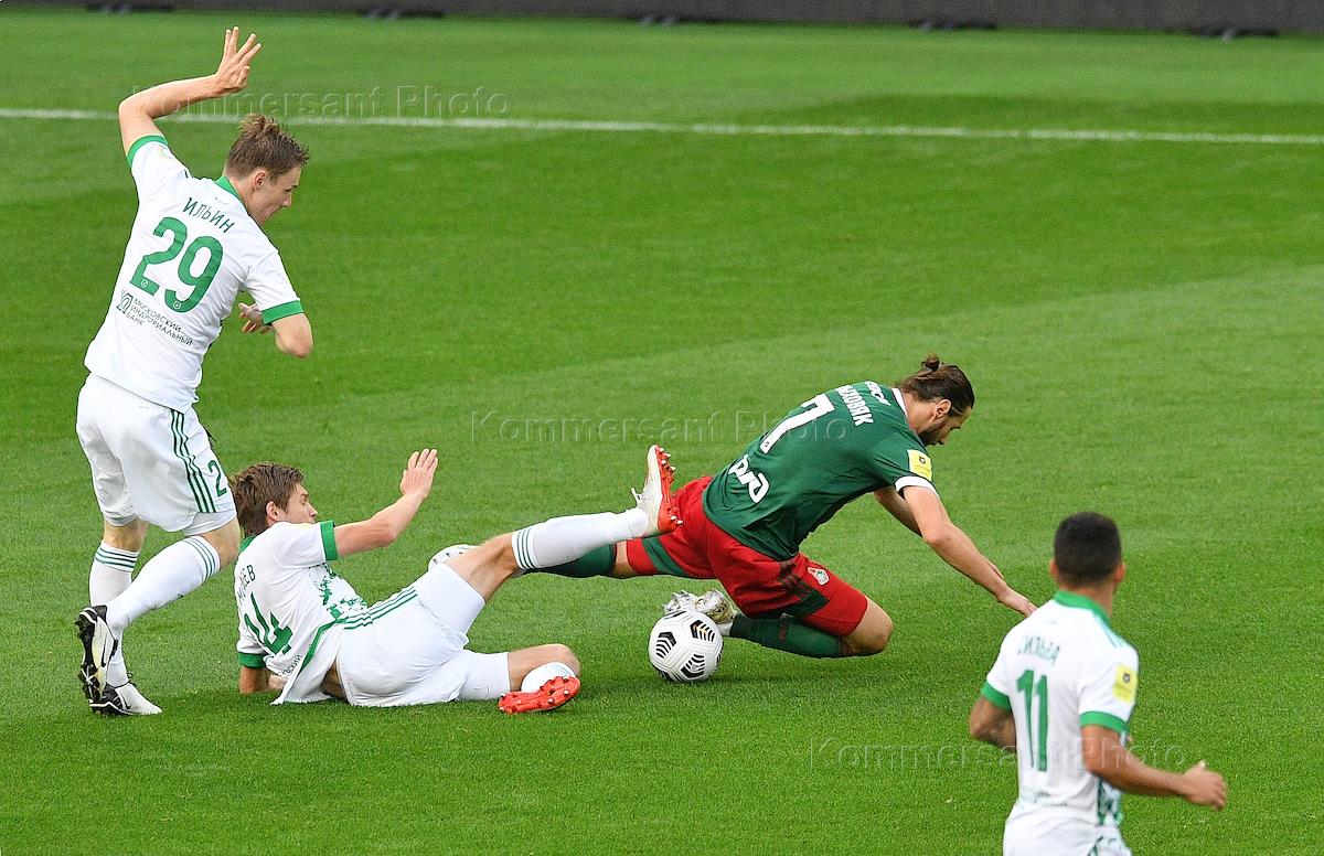 Российская Премьер-Лига (РПЛ). Тинькофф - Чемпионат России по футболу 2020/2021. 5-й тур. Матч между командами "Локомотив" (Москва) и "Ахмат" (Грозный) на стадионе "РЖД Арена". Игрок команды "Локомотив" Владислав Игнатьев (справа) и игрок команды "Ахмат" Мирослав Богосавац (в центре) во время матча.