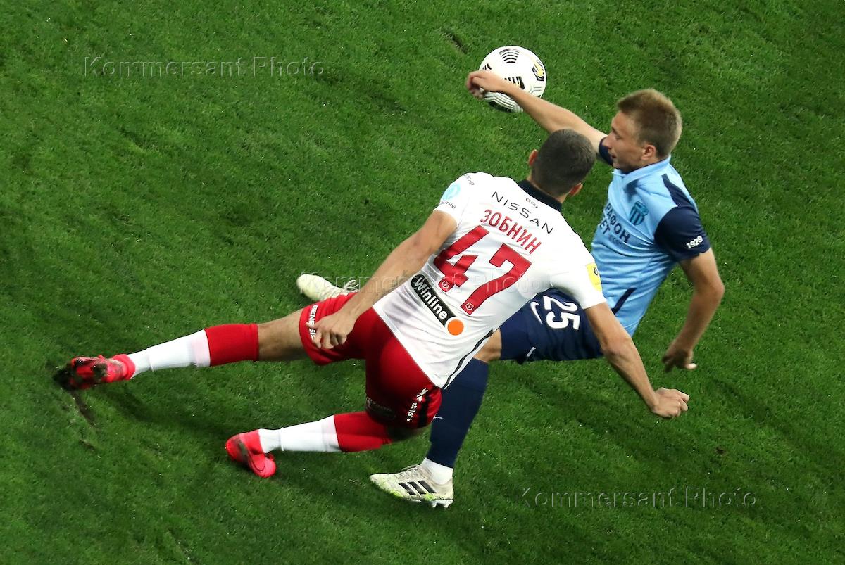Tinkoff Russian Premier League (RPL). Russian Football Championship 2020/2021. Matchday 5. Match between Rotor (Volgograd) and Spartak (Moscow) at the Volgograd Arena. Spartak's Roman Zobnin (left) and Rotor's Danil Stepanov (right) in action during the match.