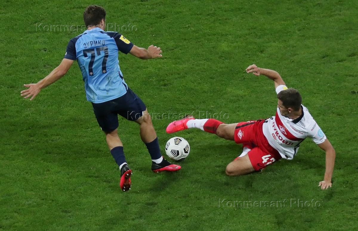 Российская Премьер-Лига (РПЛ). Тинькофф - Чемпионат России по футболу 2020/2021. 5-й тур. Матч между командами "Ротор" (Волгоград) и "Спартак" (Москва) на стадионе "Волгоград Арена". Игрок команды "Спартак" Роман Зобнин (справа) и игрок команды "Ротор" Зурико Давиташвили (слева) во время матча.