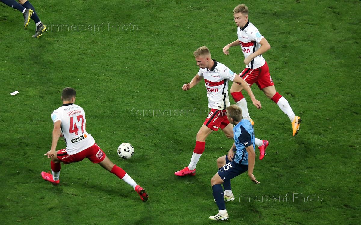 Tinkoff Russian Premier League (RPL). Russian Football Championship 2020/2021. Matchday 5. Match between Rotor (Volgograd) and Spartak (Moscow) at the Volgograd Arena. Spartak's Alexander Maksimenko (center) and Samuel Gigot (right) in action during the match.