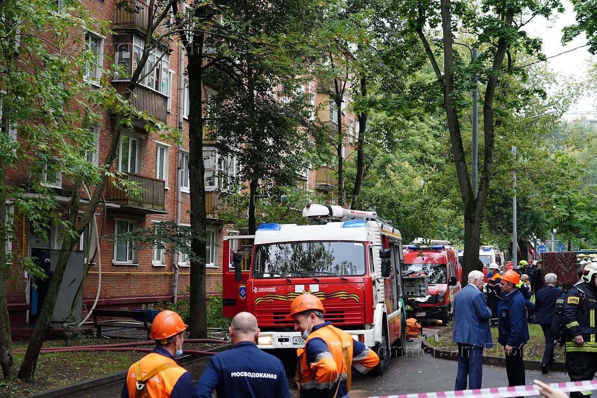 The aftermath of the residential house explosion on Kubinka Street. Mosgaz employees are seen at the accident site.