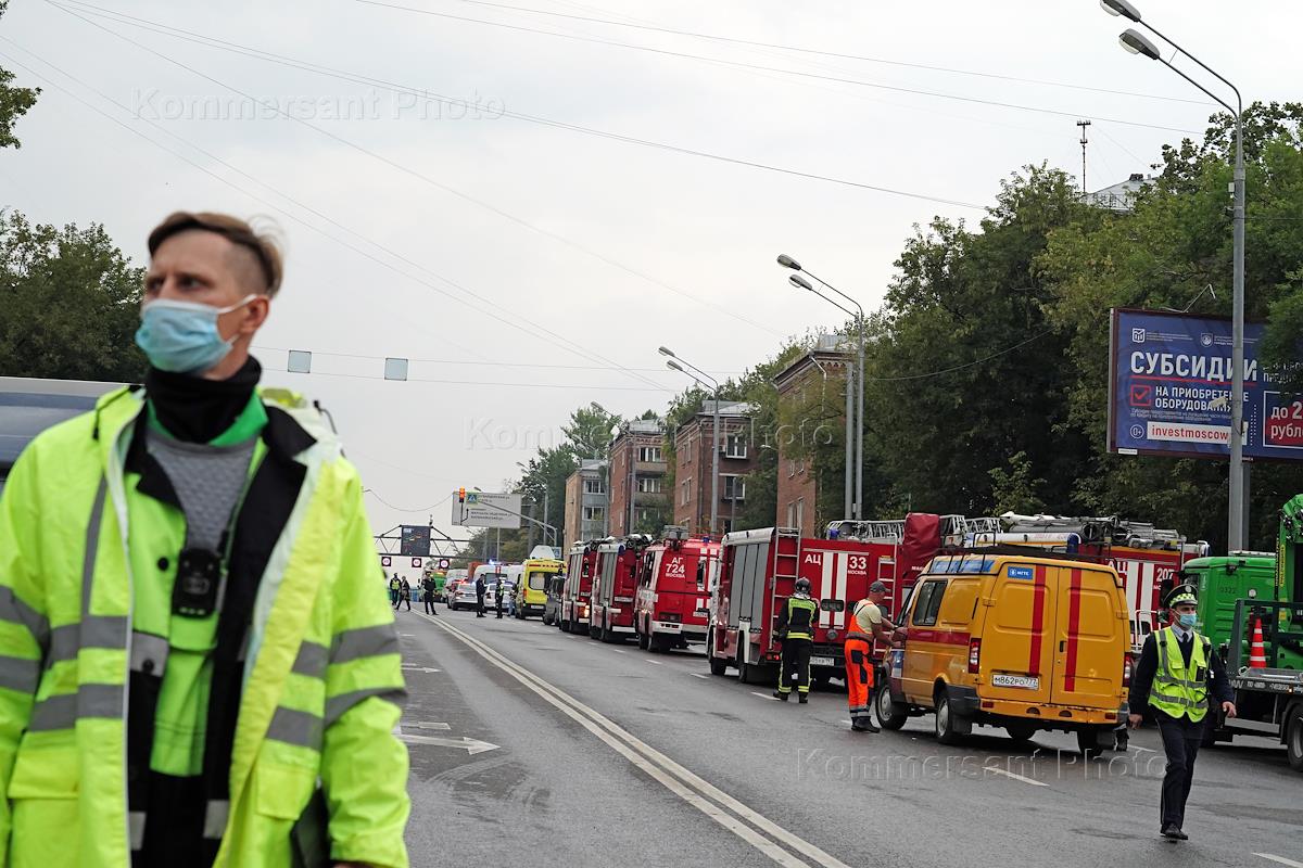 The aftermath of the residential house explosion on Kubinka Street. Fire trucks of the Russian Emergency Ministry are seen at the accident site.