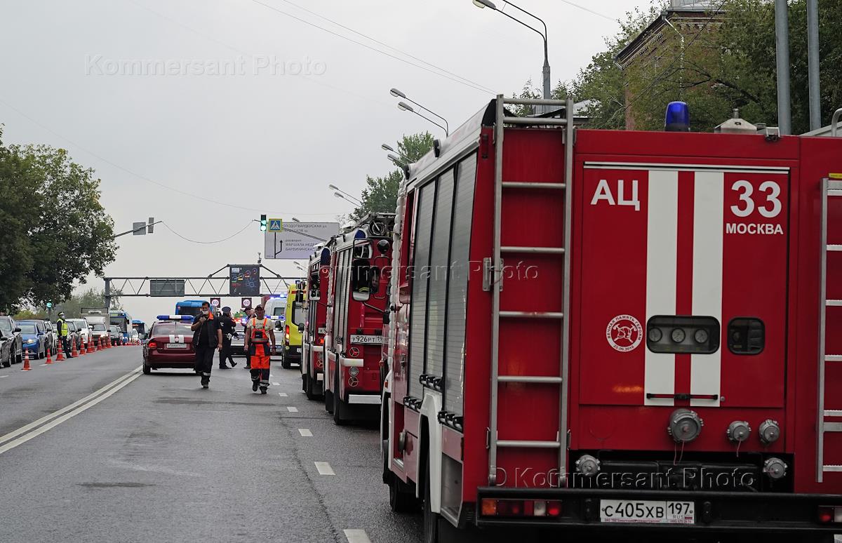 The aftermath of the residential house explosion on Kubinka Street. Fire trucks of the Russian Emergency Ministry are seen at the accident site.