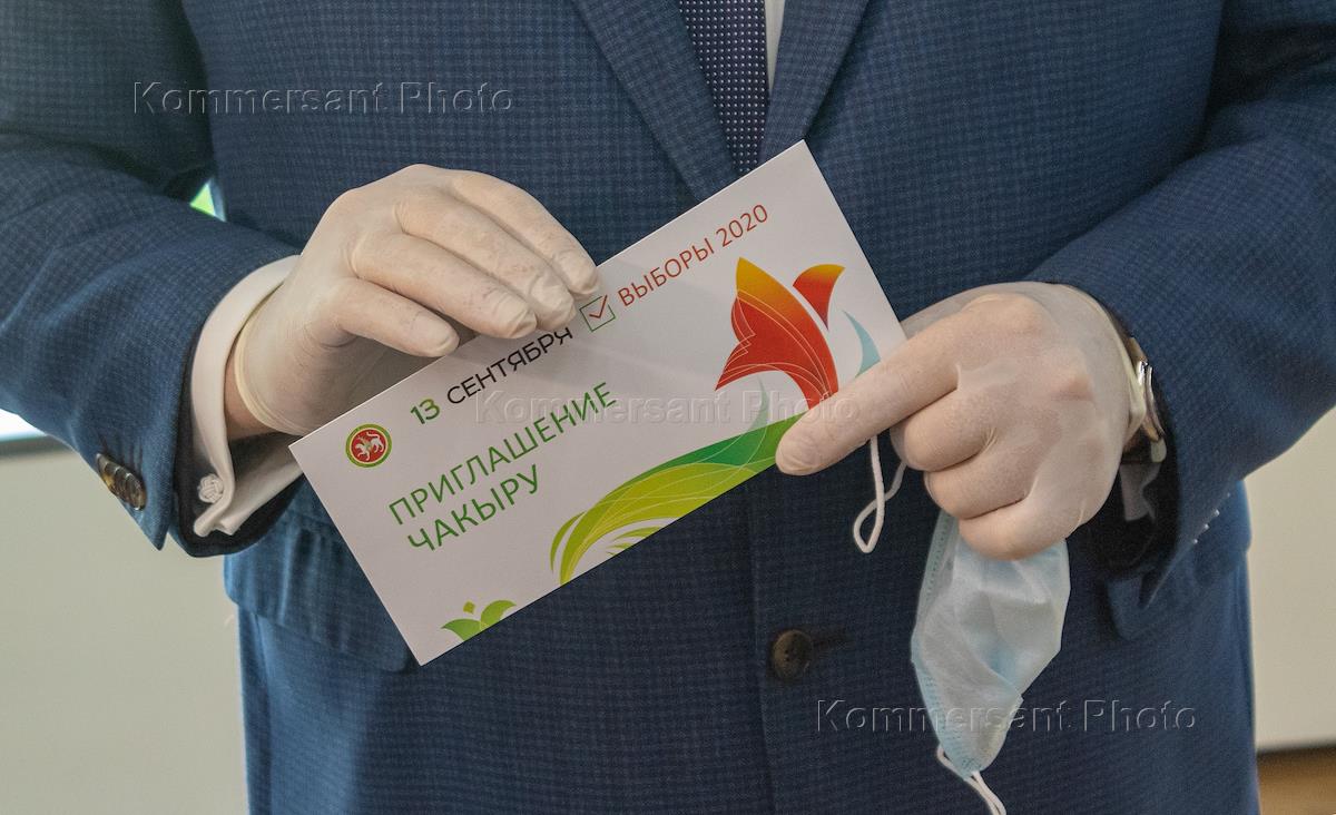 Подготовка к выборам президента Республики Татарстан, депутатов Казанской городской думы, которые пройдут 11-13 сентября. Пресс-тур на избирательный участок, расположенный в здании Культурно-досугового центра "Московский" в Казани. Отработка мер предосторожности из-за угрозы распространения коронавирусной инфекции COVID-19 в работе избирательного участка. Член избирательной комиссии в перчатках держит пригласительный билет для впервые голосующих.