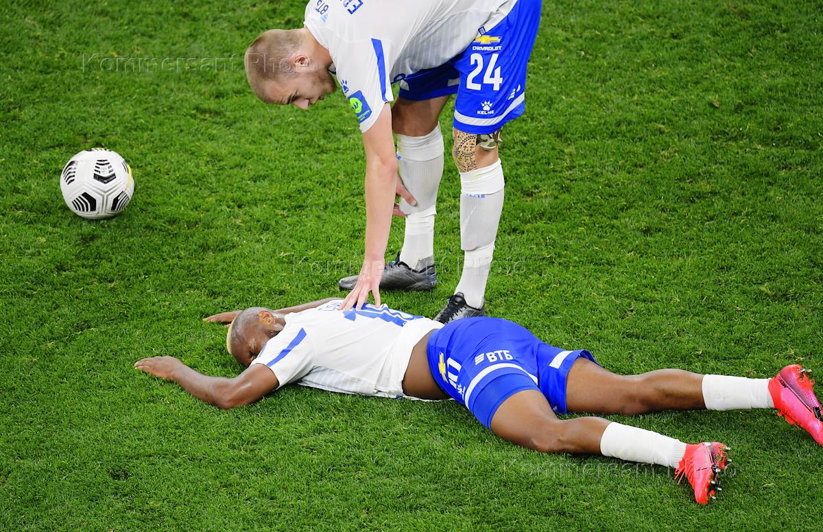 Российская Премьер-Лига (РПЛ). Чемпионат России по футболу 2020/2021. 5-й тур. Матч между командами "Динамо" (Москва) и "Зенит" (Санкт-Петербург) на стадионе "ВТБ Арена". Игроки команды "Зенит" Роман Евгеньев (справа) и Сильвестр Игбун (слева) во время матча.