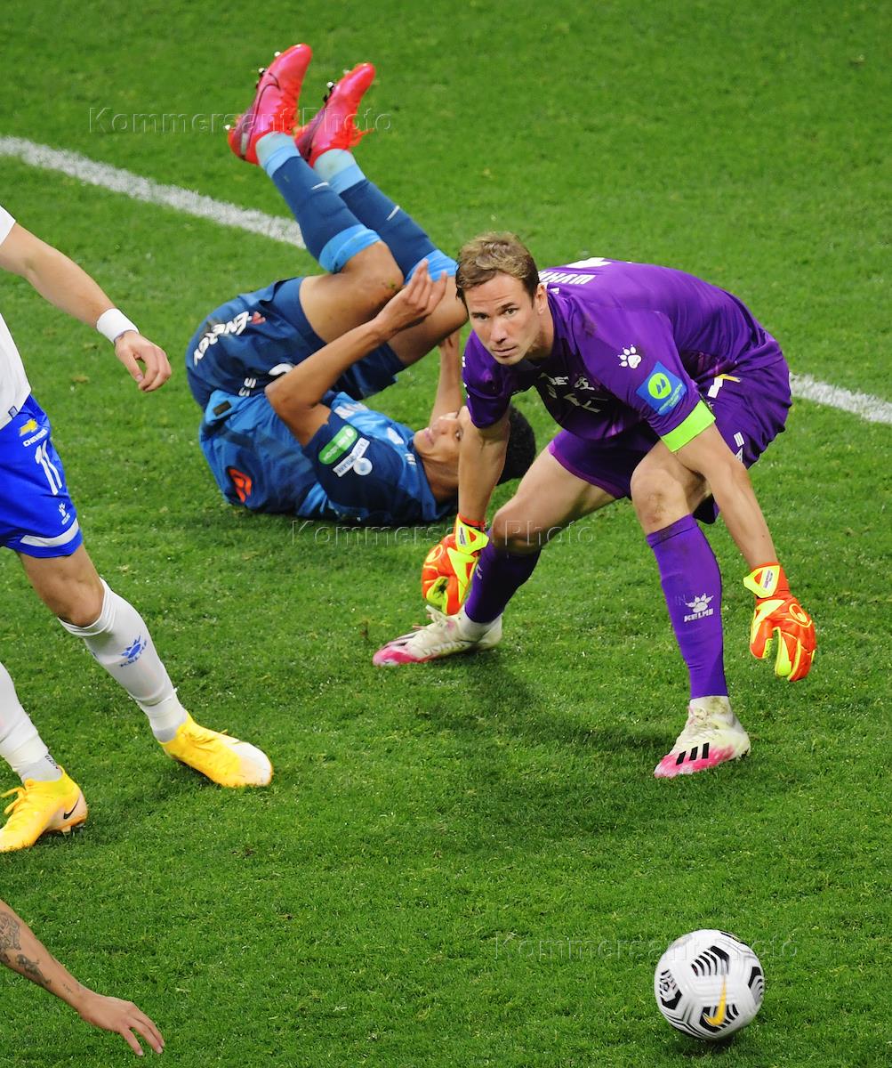 Российская Премьер-Лига (РПЛ). Чемпионат России по футболу 2020/2021. 5-й тур. Матч между командами "Динамо" (Москва) и "Зенит" (Санкт-Петербург) на стадионе "ВТБ Арена". Игрок команды "Динамо" Николай Комличенко (слева) и вратарь команды "Динамо" Антон Шунин (справа) во время матча.