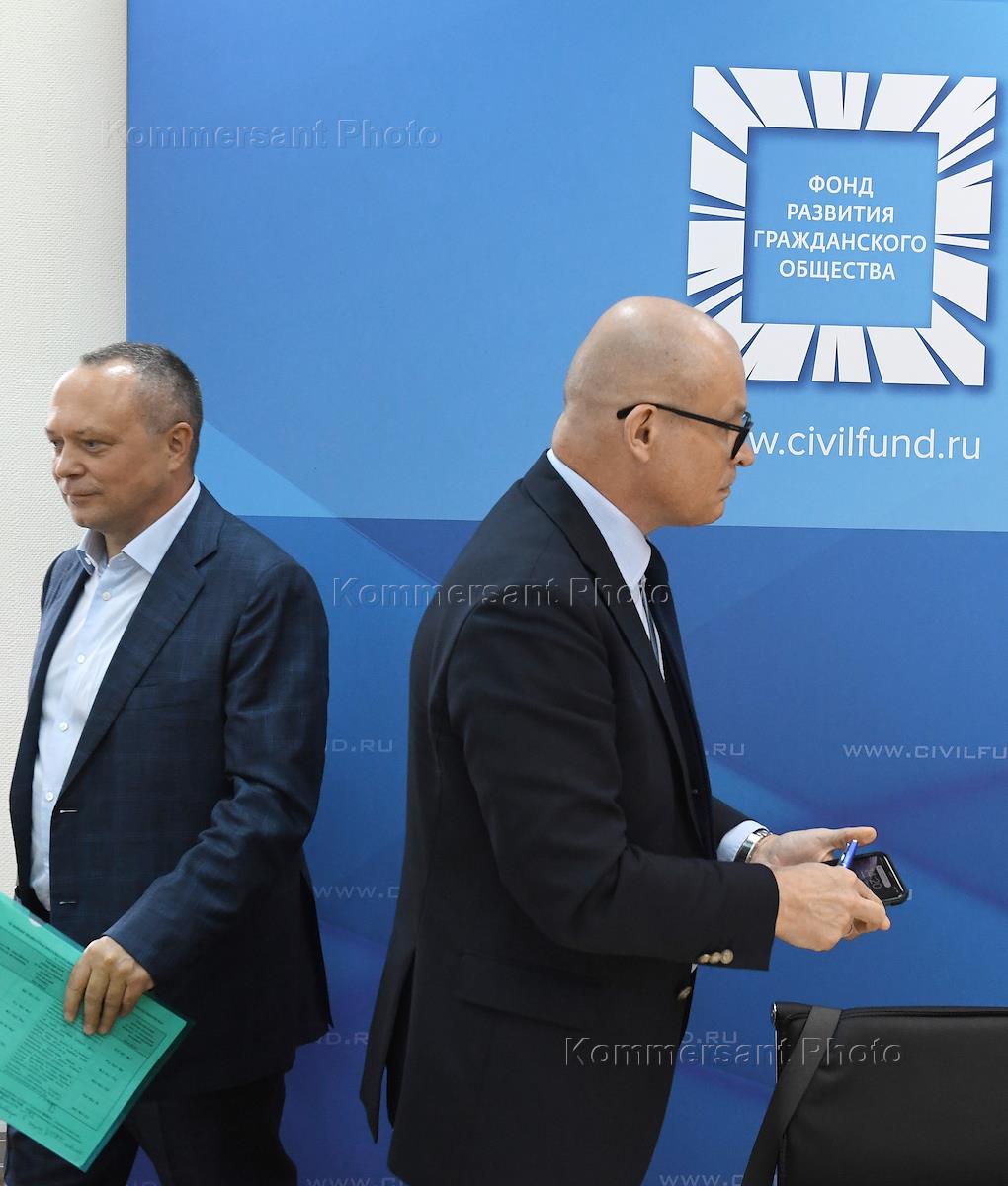 Круглый стол на тему "Единый день голосования-2020: сценарии кампаний и прогноз результатов" прошел в конференц-зале Фондв развития гражданского общества (ФоРГО). Директор по политическому анализу компании "ИНОМАР" Виктор Потуремский (справа) и глава ФоРГО Константин Костин (слева) во время проведения круглого стола.