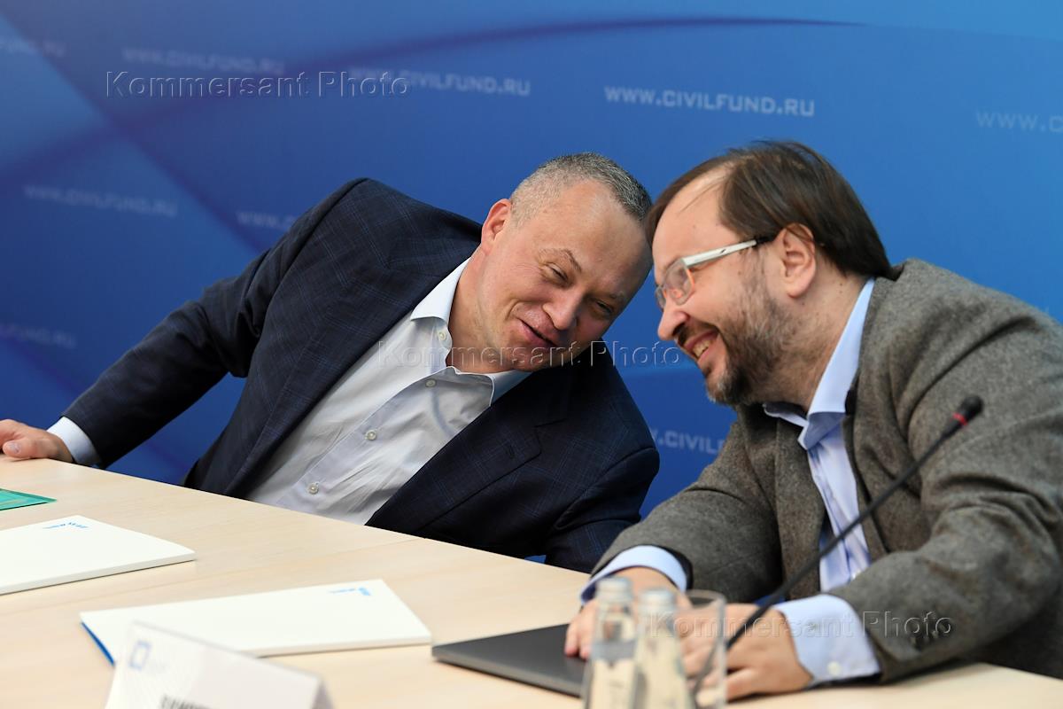 Круглый стол на тему "Единый день голосования-2020: сценарии кампаний и прогноз результатов" прошел в конференц-зале Фондв развития гражданского общества (ФоРГО). Директор по политическому анализу компании "ИНОМАР" Виктор Потуремский (справа) и глава ФоРГО Константин Костин (слева) во время проведения круглого стола.
