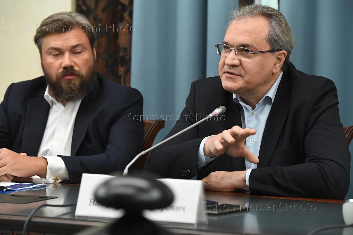 Round table on the topic "Digital bulls in the information shop: Western tech giants - a threat to the sovereignty of the state" in the Civic Chamber of the Russian Federation. First Deputy Chairman of the Civic Chamber Committee on Information Society Development Alexander Malkevich (left) is seen before the round table.
