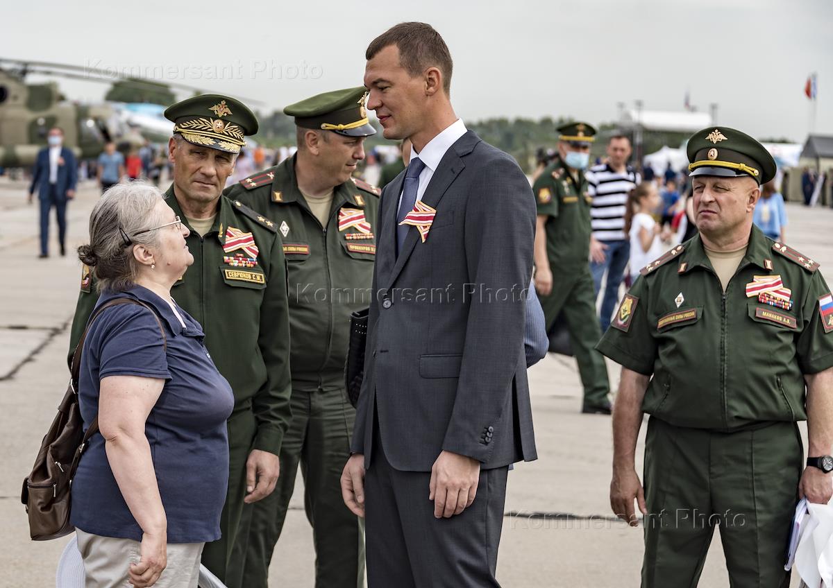 Opening of the main site of the Army-2020 Military-Technical Forum in the Eastern Military District. Acting Head of the Khabarovsk Region Mikhail Degtyarev (left) and Deputy Commander of the Eastern Military District Sergei Sevryukov (right) are seen before the ceremony.
