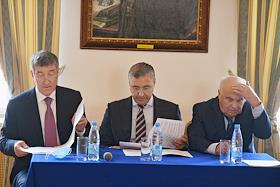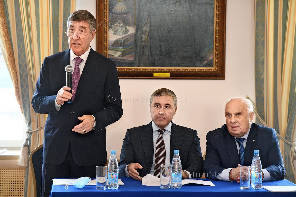 Церемония вручения премии правительства России за 2019 год в области науки и техники за разработку и реализацию механизмов структурной перестройки и технологического развития угольной промышленности России прошла в Государственном геологическом музее имени В.И.Вернадского. Слева направо: председатель правления МНГК "СоюзНефтеГаз" Юрий Шафраник, министр науки и высшего образования России Валерий Фальков и президент Государственного геологического музея имени В.И.Вернадского Юрий Малышев во время церемонии.