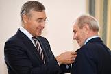 Церемония вручения премии правительства России за 2019 год в области науки и техники за разработку и реализацию механизмов структурной перестройки и технологического развития угольной промышленности России прошла в Государственном геологическом музее имени В.И.Вернадского. Министр науки и высшего образования России Валерий Фальков (слева) и президент Государственного геологического музея имени В.И.Вернадского Юрий Малышев (справа) во время церемонии.
