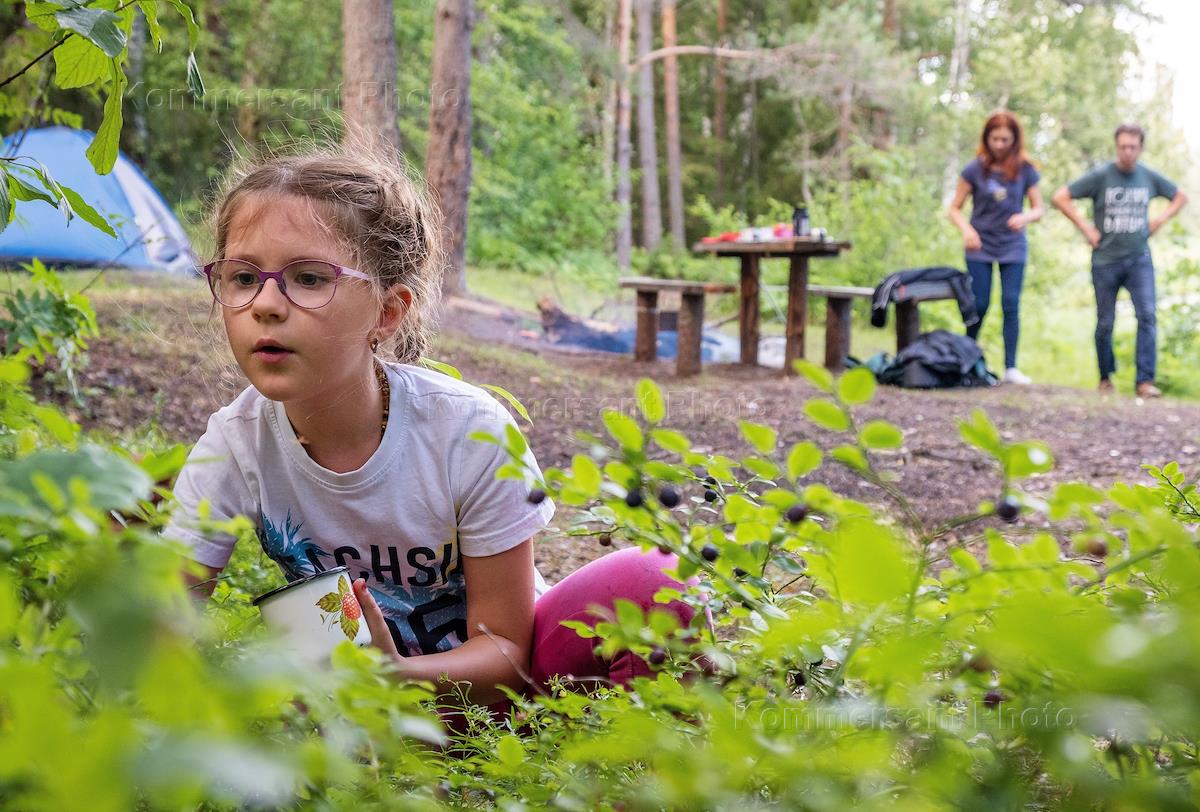 Выезд семьи Романович на отдых с палаткой. Дочь Леонида и Светланы Романович Полина собирает чернику рядом с бивуаком.