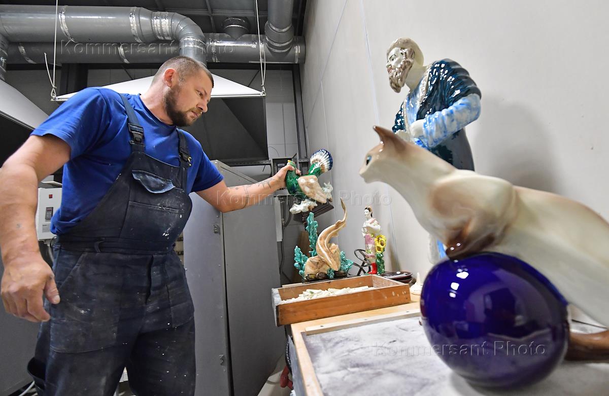 Конаковский фаянсовый завод. Жанровая фотография. Сотрудник завода в цехе обжига. Фаянсовые скульптуры после второго обжига, называемого "политой".