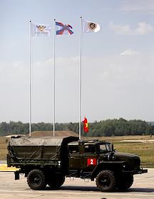 Армейские международные игры "АрМИ-2020". Международный конкурс "Мастера артиллерийского огня" на полигоне "Широкий Карамыш". В соревнованиях артиллерийских экипажей принимают участие более 100 военнослужащих из Армении, Белоруссии, Вьетнама, России, Таджикистана и Узбекистана. Военнослужащие Народной армии Вьетнама в автомобиле во время соревнований.