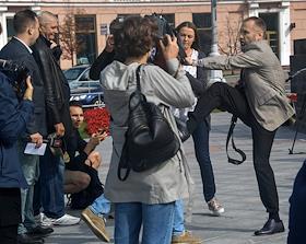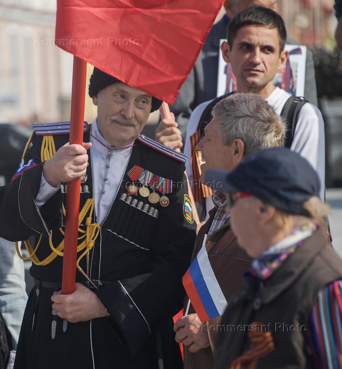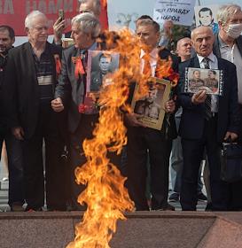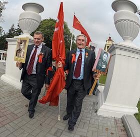 Политическая ситуация в Минске. Митинг в честь 75-летия окончания Второй мировой войны на площади Победы. Глава профсоюза МЧС и основатель "Клуба мироздравомыслия" Виктор Малофеев (справа) во время митинга.