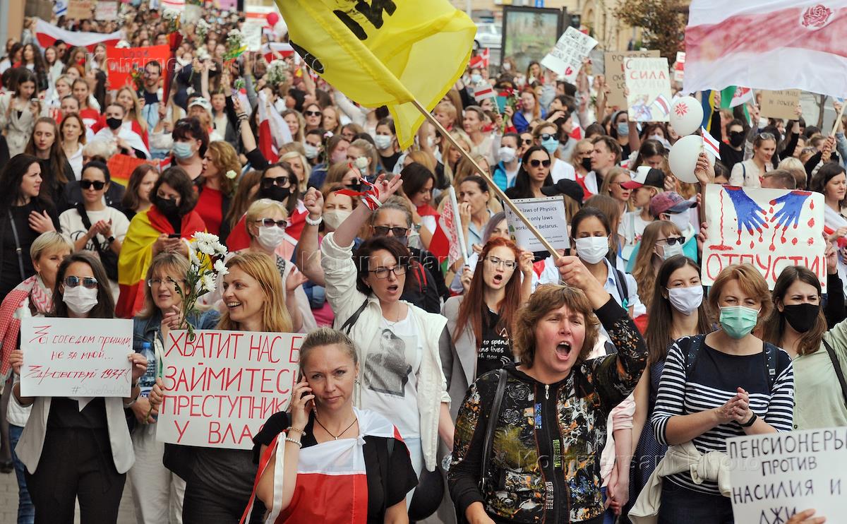 Участницы женского марша мира на проспекте Независимости. Со дня выборов президента Белоруссии 9 августа в Минске и других городах республики проходят массовые акции протеста несогласных с результатами голосования.