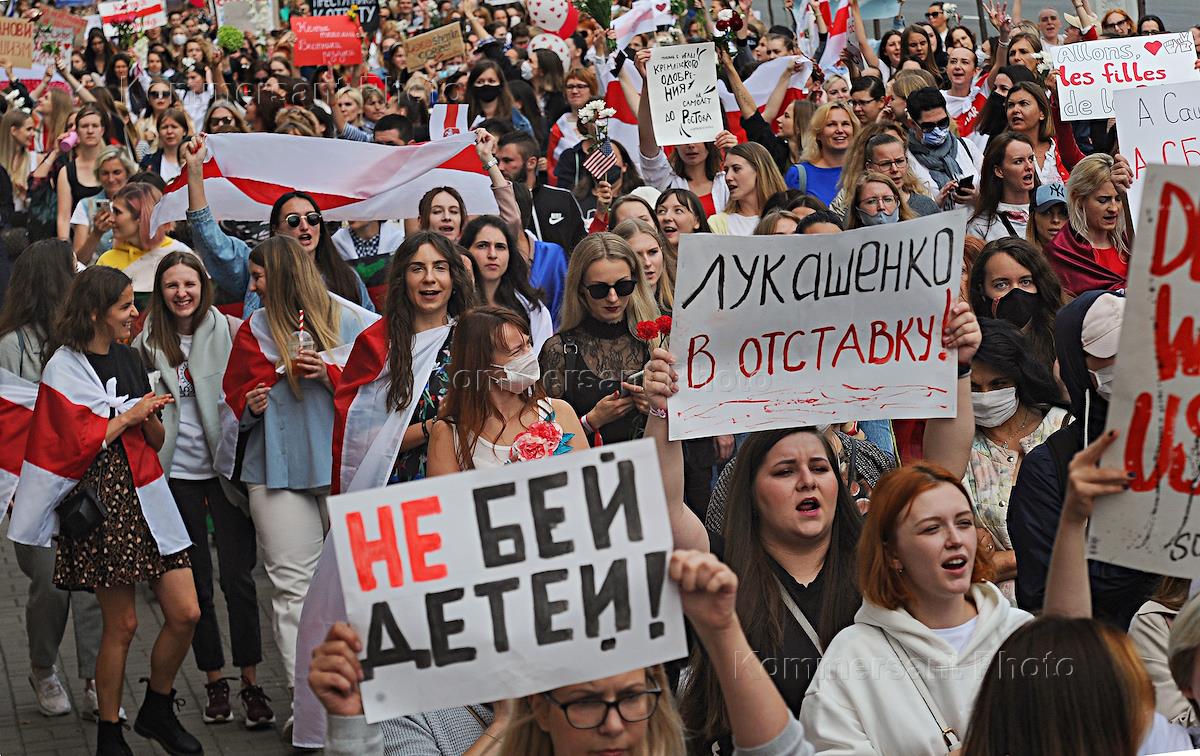 Участницы женского марша мира на проспекте Независимости. Со дня выборов президента Белоруссии 9 августа в Минске и других городах республики проходят массовые акции протеста несогласных с результатами голосования.