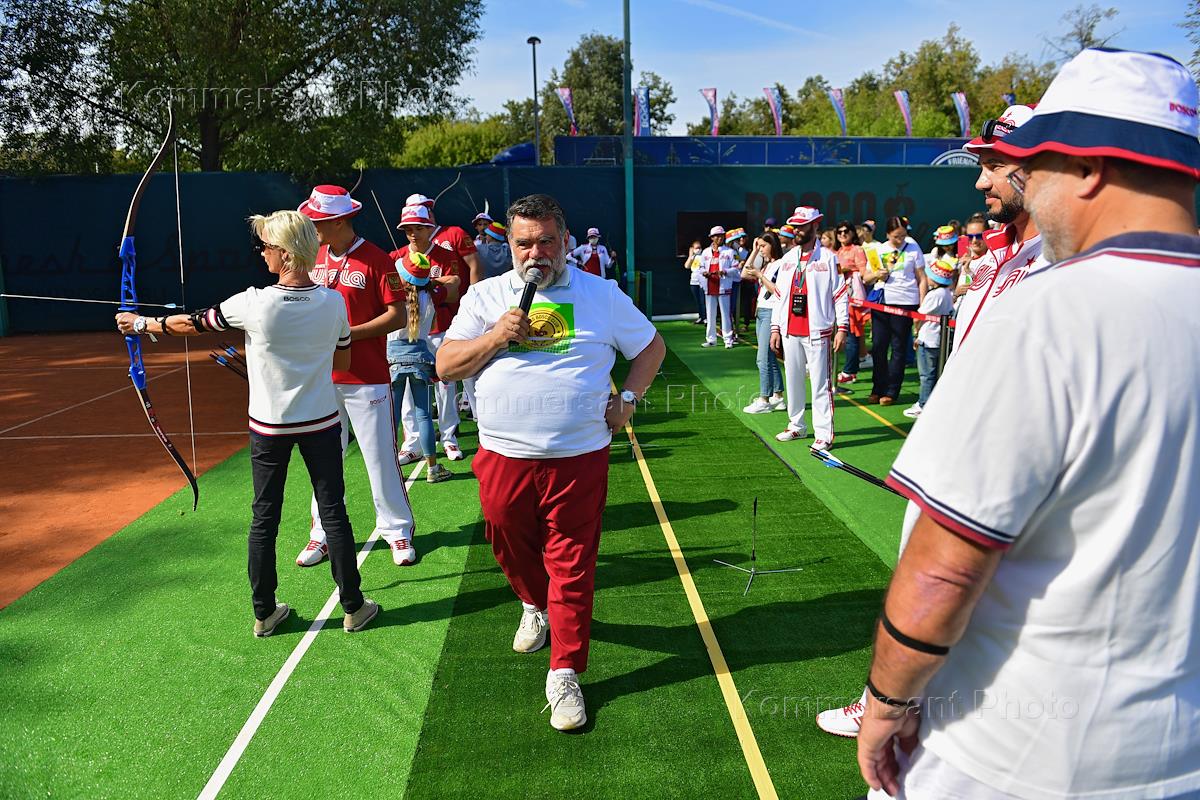 II-й благотворительный теннисный турнир Bosco Friends Open на кортах Bosco Tennis Club в "Лужниках". Участники во время турнира по стрельбе из лука в рамках теннисного турнира.