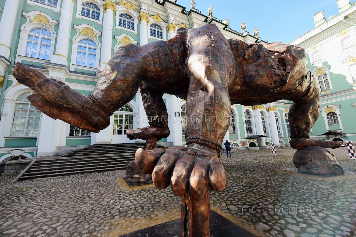 Пресс-показ выставки "Чжан Хуань. В пепле истории" в Государственном Эрмитаже. Металлическая скульптура, состоящая из гигантских ног и туловища, во дворе Государственного Эрмитажа.