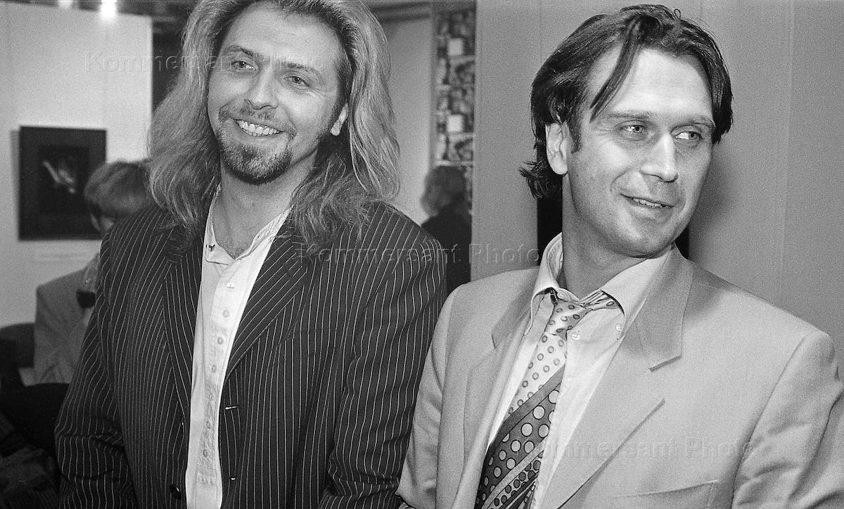Выставка художника Юрия Чернова. Режиссер Юрий Грымов (слева) и продюсер Сергей Лисовский (справа) на выставке.